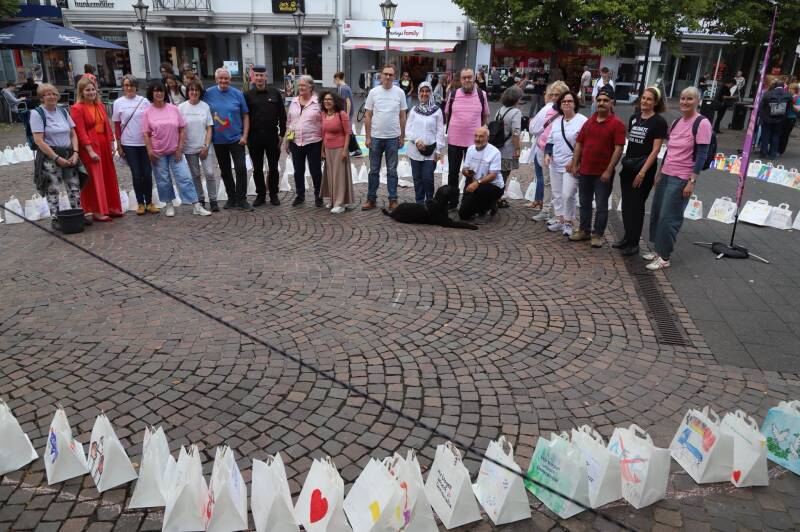 Am 5. September verwandelten über 300 gestaltete Papiertaschen den Siegburger Marktplatz in ein buntes Zeichen für Demokratie und Vielfalt. Menschen aus Siegburger Schulen, Vereinen, Gemeinden und Initiativen hatten ihre Gedanken und Wünsche auf die Taschen gebracht und gemeinsam auf dem Marktplatz installiert – organisiert von "Siegburg zeigt Haltung" und auf Grundlage des BBK-Projekts "Wir tragen unsere Demokratie".